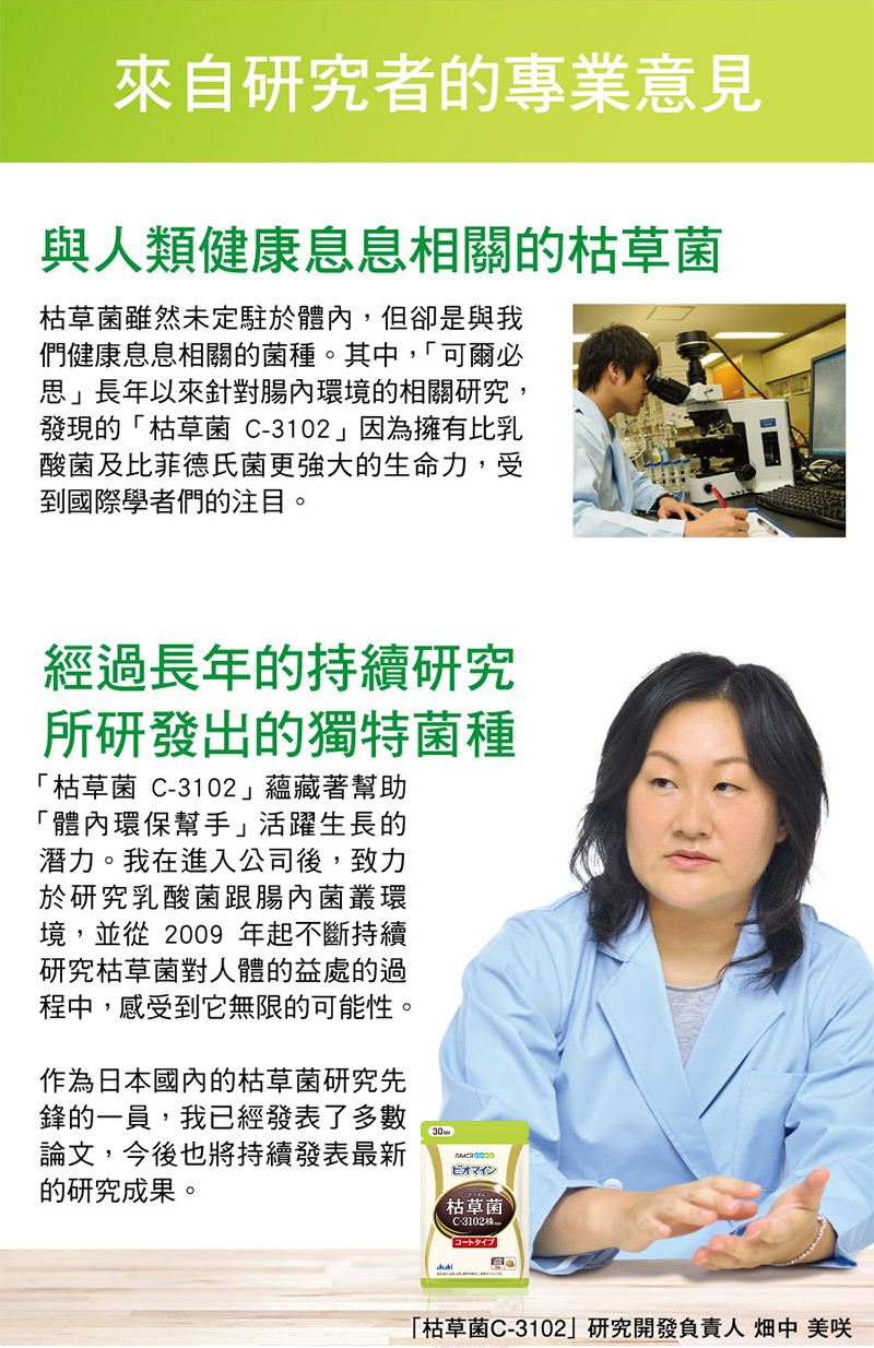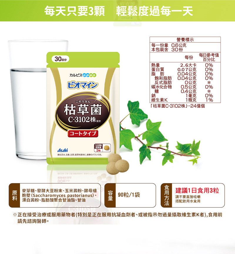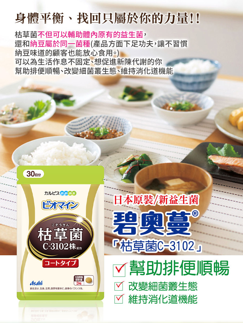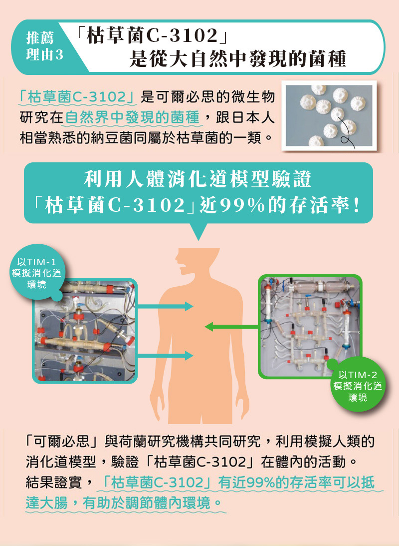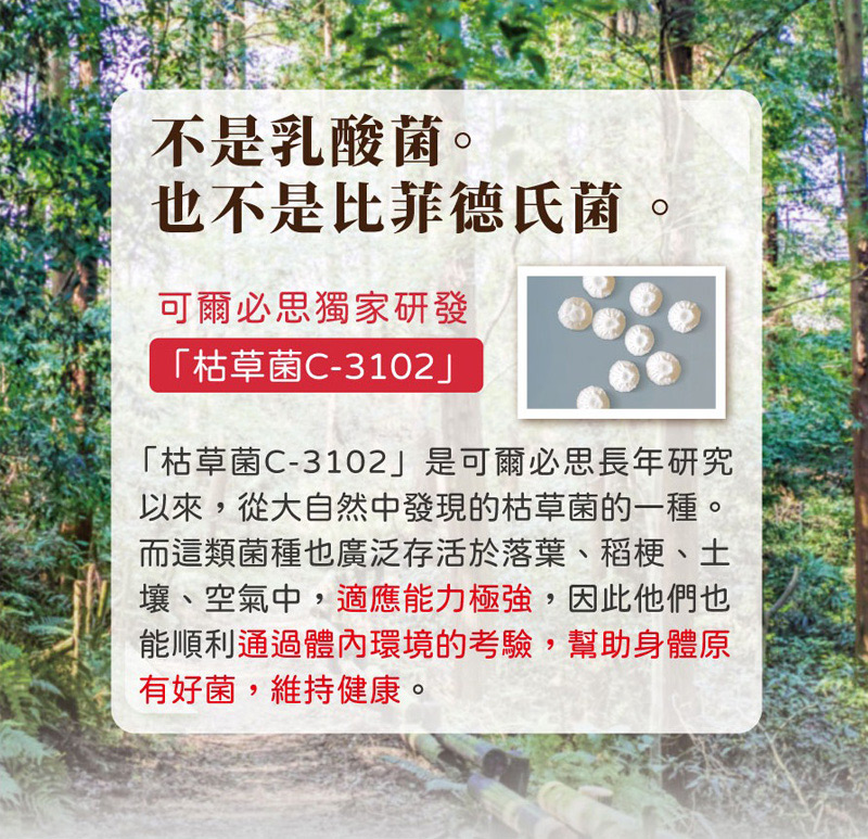 是枯草菌的其中一株,跟納豆菌屬於同一個菌類,跟日本的飲食文化有相當深的淵源。 我們也在產品製造方面下足功夫,讓不習慣納豆味道的顧客也能放心食用。 直接咀嚼還是會有納豆的味道,建議搭配飲用水食用。 每粒含有8億個、每日份量(3粒)含有24億個「枯草菌C-3102」。
