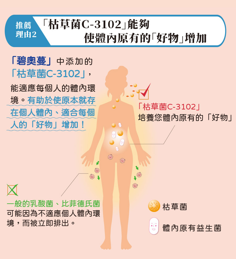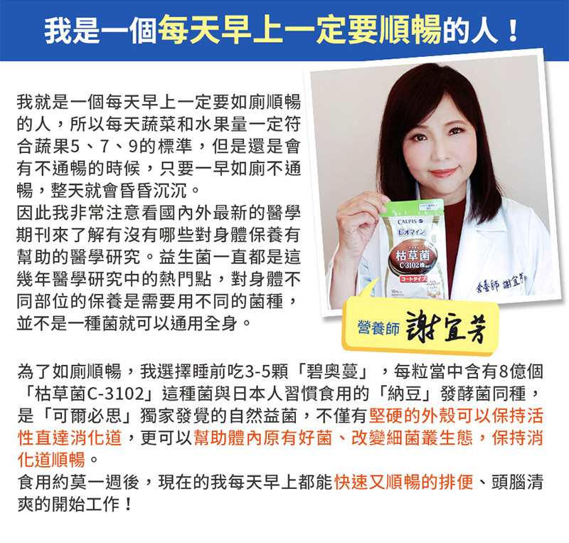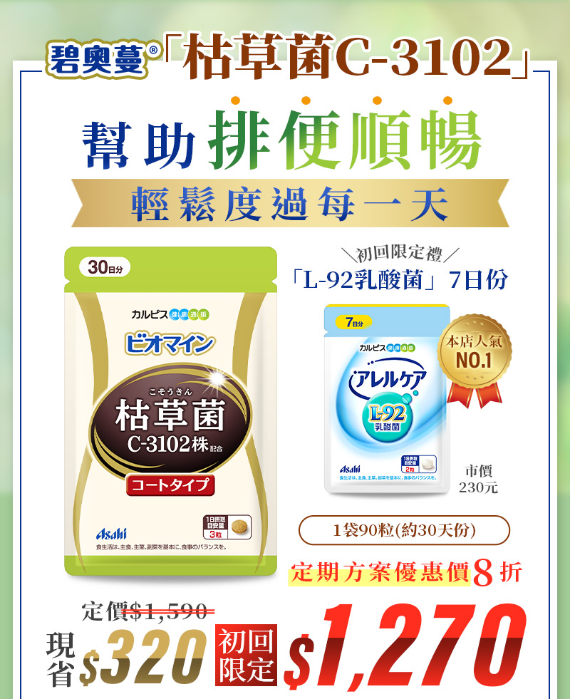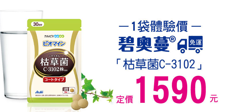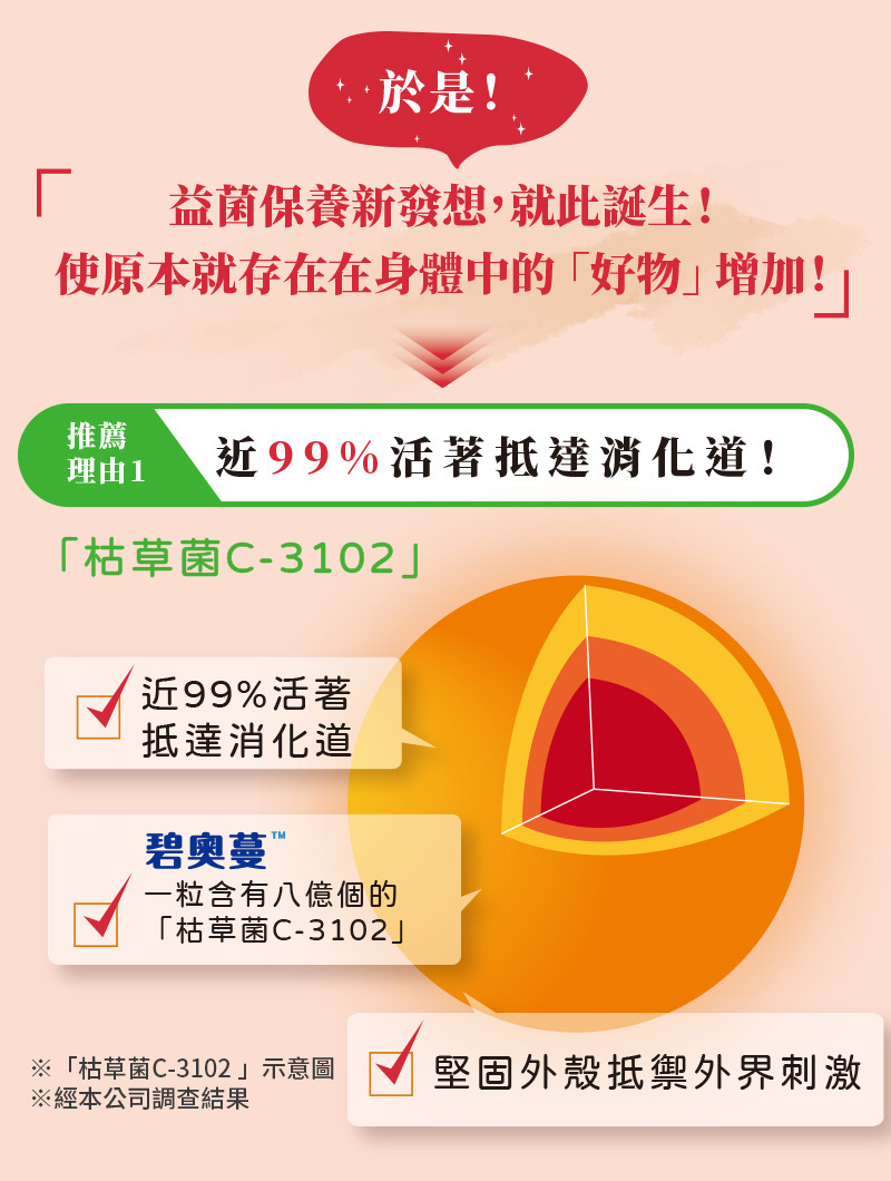 是枯草菌的其中一株,跟納豆菌屬於同一個菌類,跟日本的飲食文化有相當深的淵源。 我們也在產品製造方面下足功夫,讓不習慣納豆味道的顧客也能放心食用。 直接咀嚼還是會有納豆的味道,建議搭配飲用水食用。 每粒含有8億個、每日份量(3粒)含有24億個「枯草菌C-3102」。